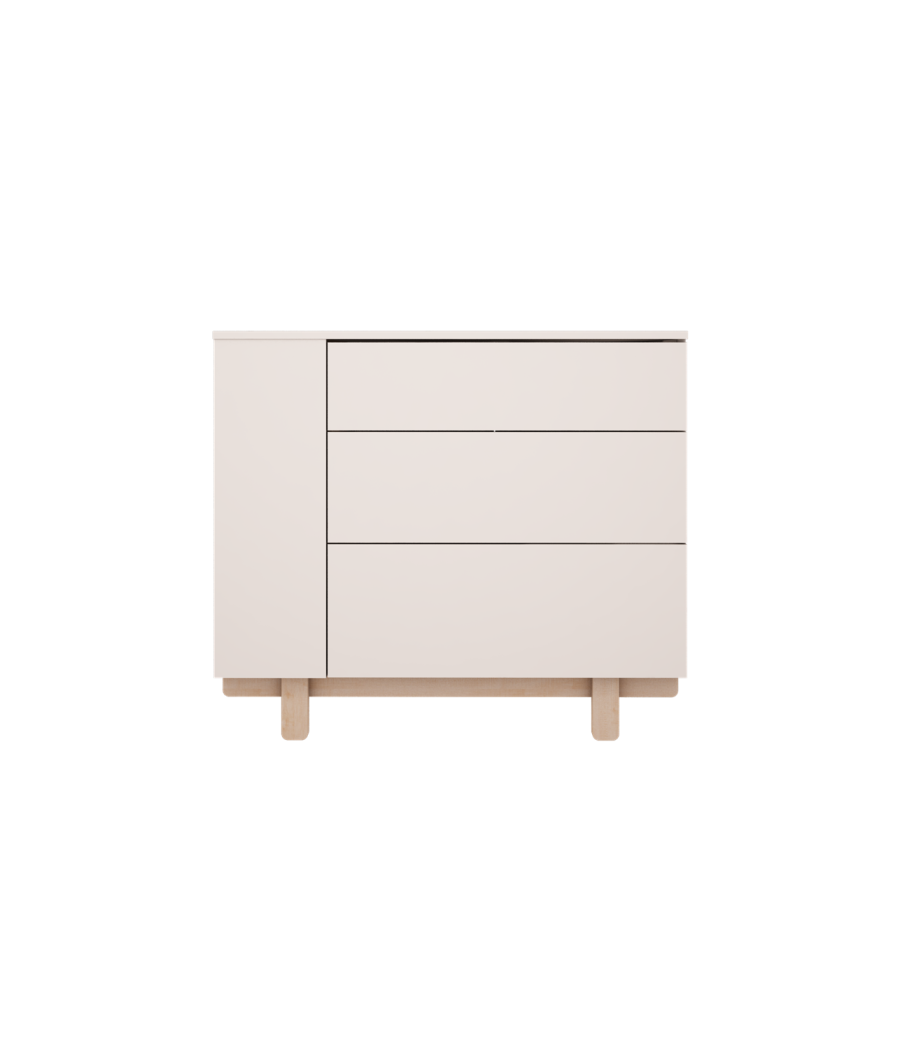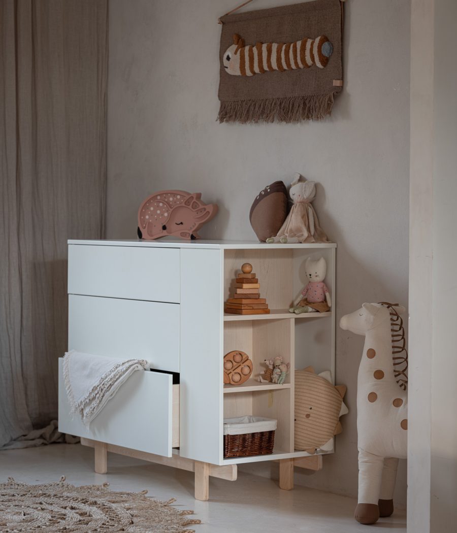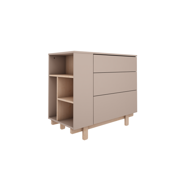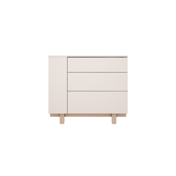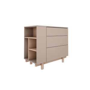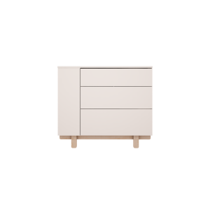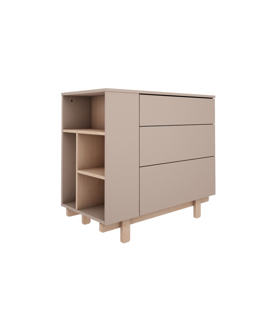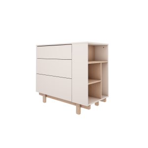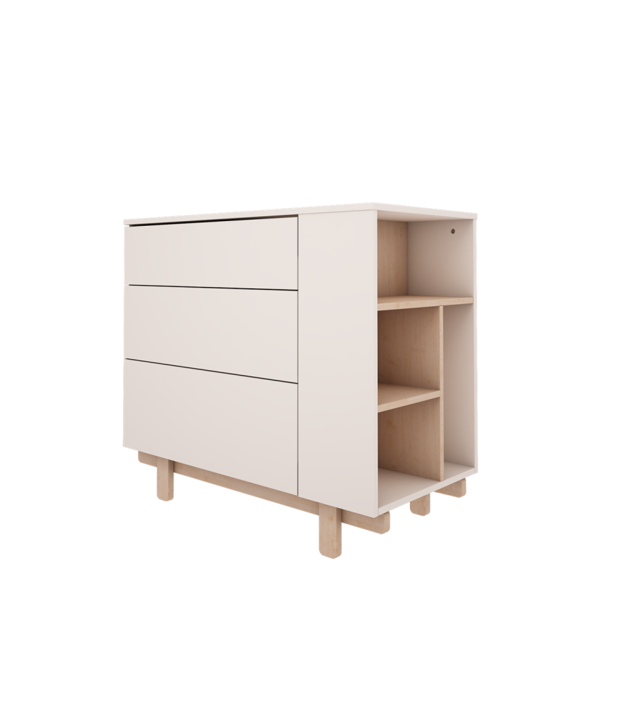 Komoda Basic izrađena je od lameliranih ploča, a nogice od bukvinog drva. Ima tri prostrane ladice koje su opremljene vrlo kvalitetnim samozatvarajućim vodilicama, a osim njih sa bočne strane tu su i četiri otvorene police koje možete prema vlastitiom odabiru postaviti na lijevoj ili desnoj bočnoj strani. Dimenzije komode su 105 x 52 x 92 cm. Svi elementi bojani su vodenim lakom certificiranim za usklađenost sa EN71/3 sigurnosnom normom.