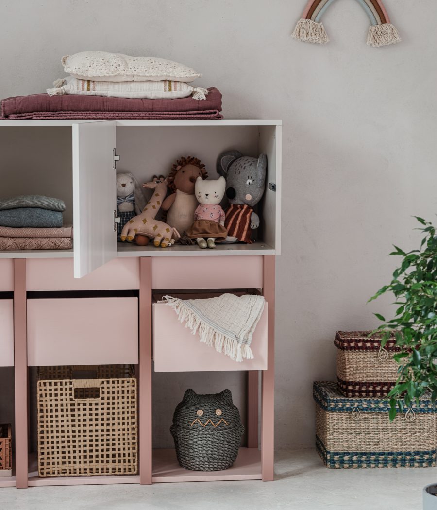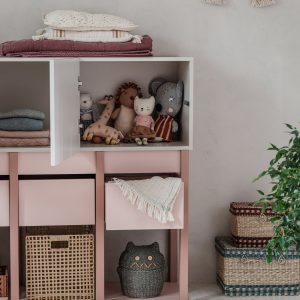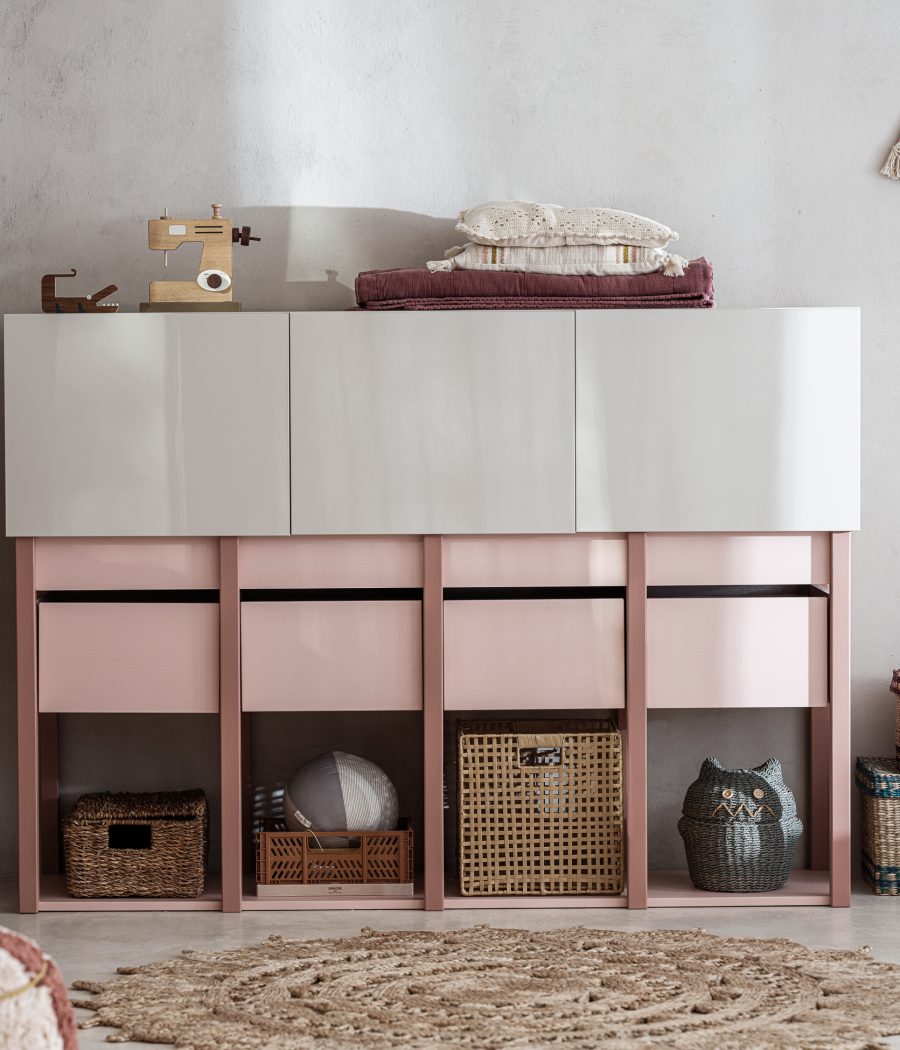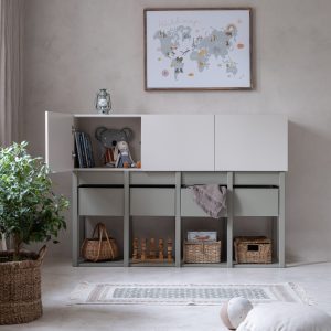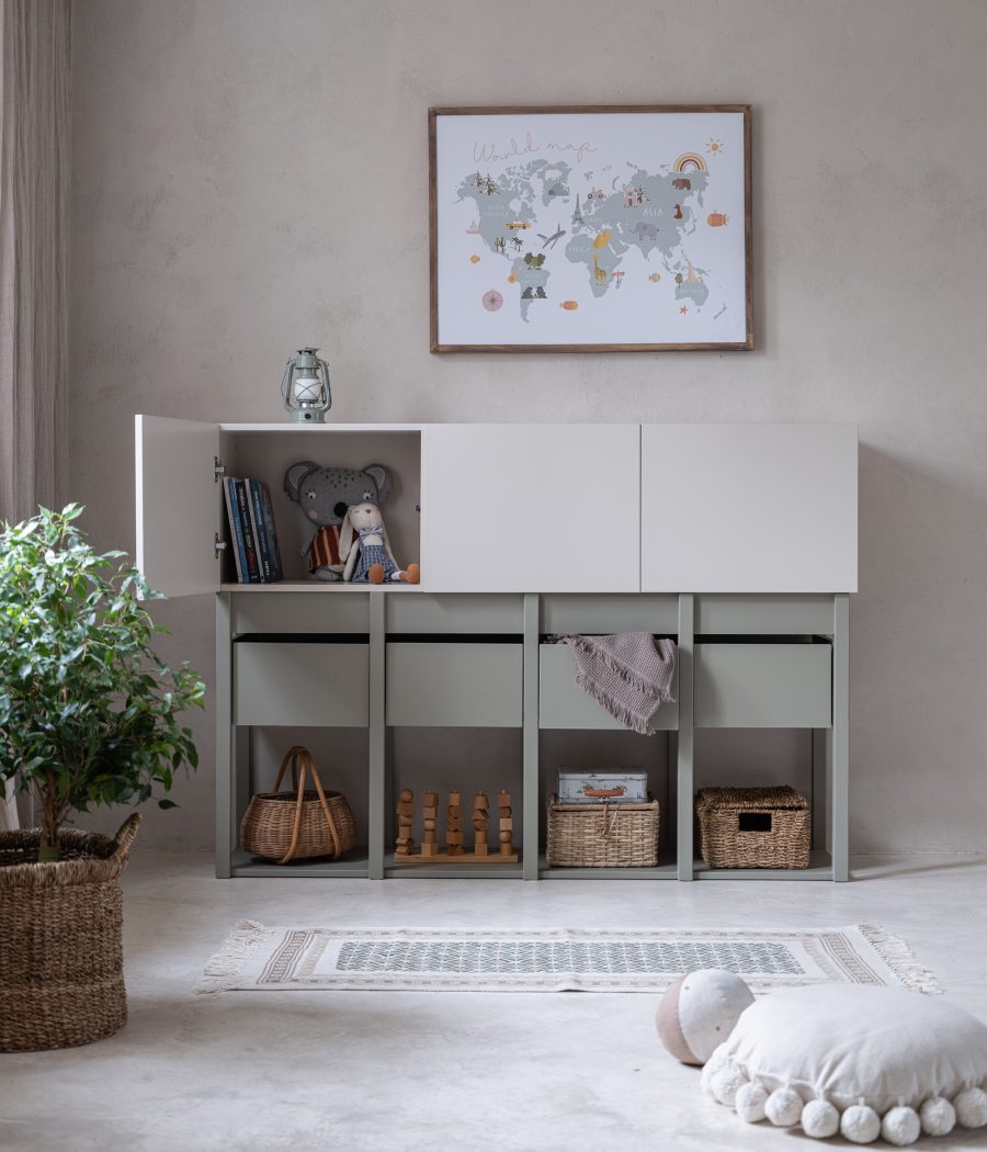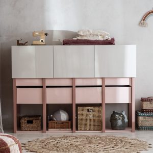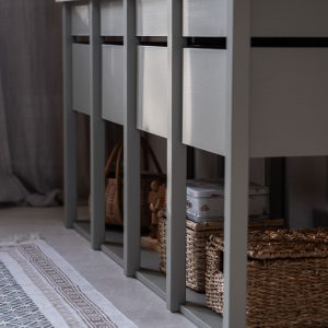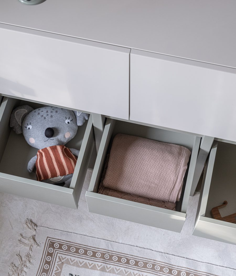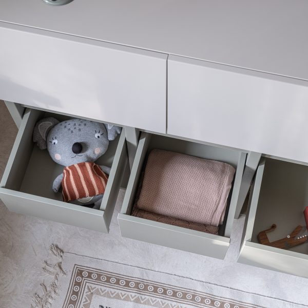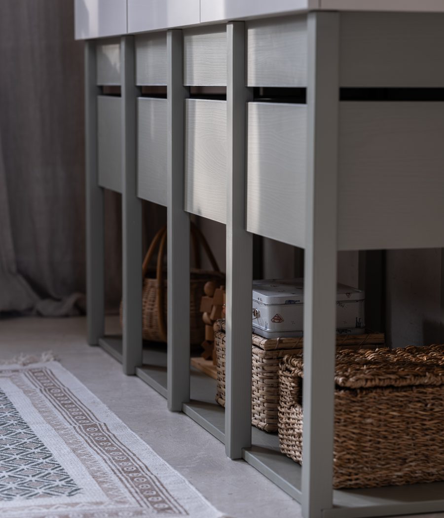 Ladice i vrata komode opremljeni su vrlo kvalitetnim samozatvarajućim vodilicama i pantima. Dimenzije komode su 155 x 42 x 109 cm. Izrađena je od MDF-a, lameliranih ploča i nogica od borova drva. Proizvedeno u skladu sa sigurnosnom normom EN71/3 za dječji namještaj i igračke.