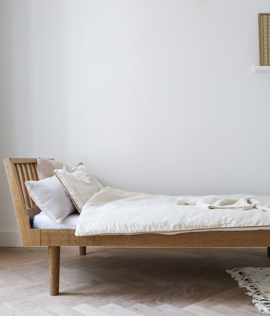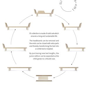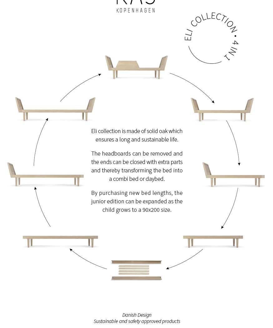 Krevet inovativnog i bezvremenskog dizajna izrađen je od masivne hrastovine, što mu daje prekrasan nordijski izgled. Uzglavlja su ergonomski dizajnirana i udobna za naslanjanje, a moguće ih je potpuno ukloniti te tako krevet pretvoriti u dnevni krevet. Na bočne stranice moguće je montirati zaštitne ogradice. Dimenzije kreveta su 94 x 226 x 72 cm, a preporučene dimenzije madraca su 90x200 cm. Noge u obliku stošca i nevidljivi vijci dio su prepoznatljivog dizajna KAS Kopenhagen.