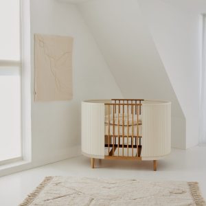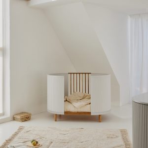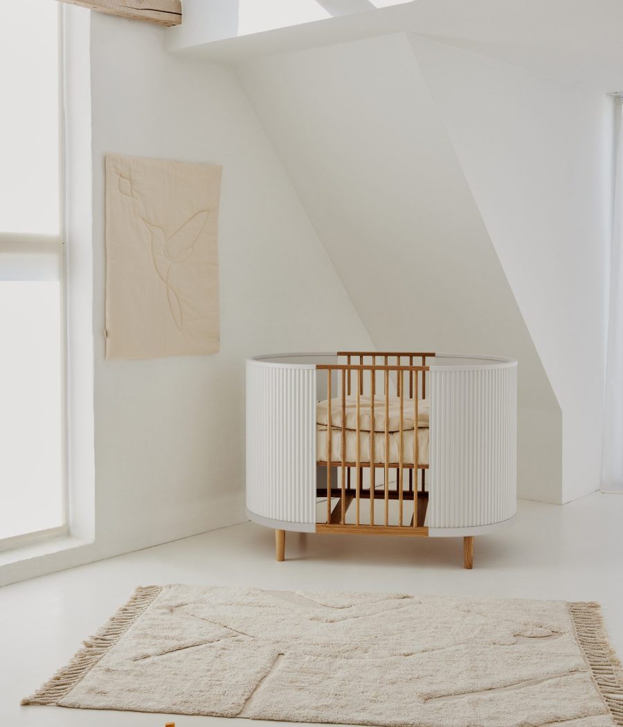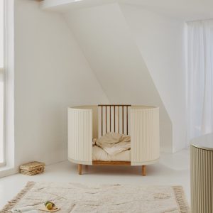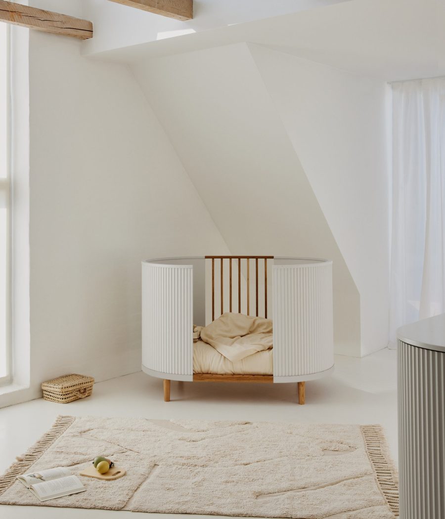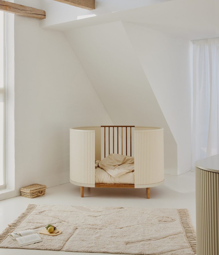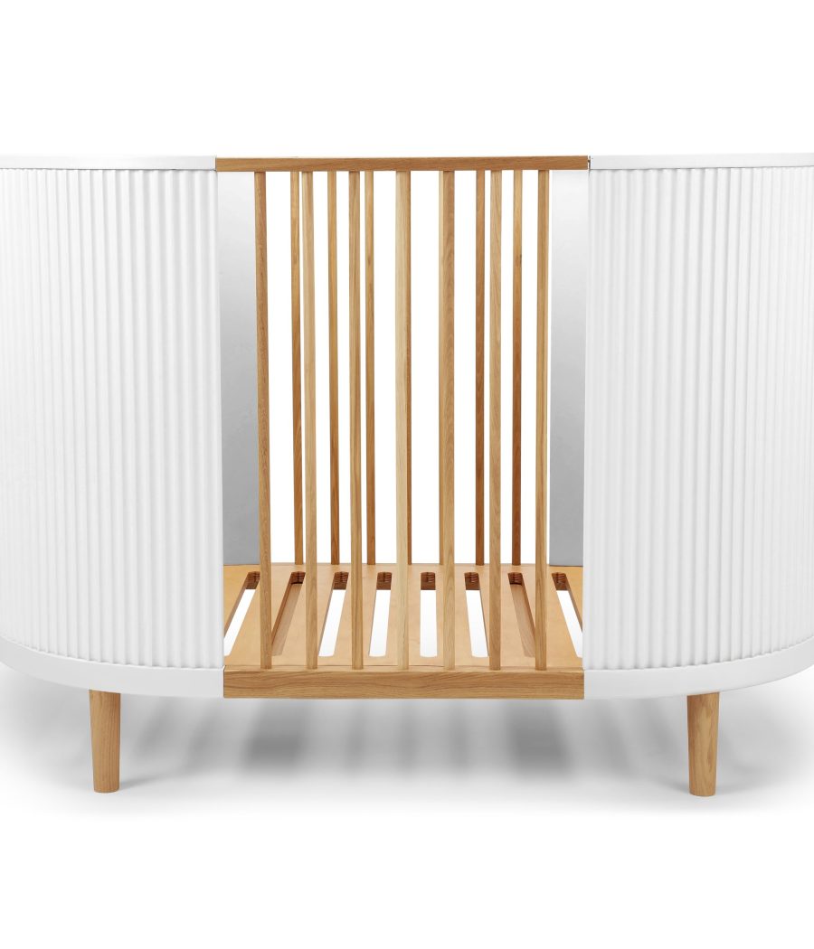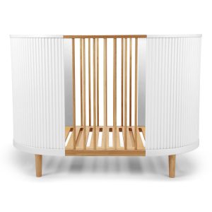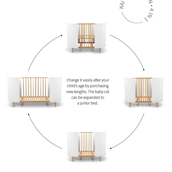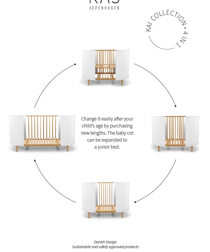 Model inspiriran dorskim stupovima iz grčke arhitekture, a predstavlja vodeći prepoznatljivi proizvod tvrtke KAS Kopenhagen. Jedinstveni krevetić sa svojim klasičnim bezvremenskim dizajnom – ovalnog elegantnog oblika i pomno promišljenog dizajna može se koristiti generacijama.  Krevet prati rast vašeg djeteta, s podnicom podesivom po visini koja se može podizati i spuštati u 2 položaja. Kada je dijete dovoljno staro da može samostalno izlaziti iz kreveta, jedna strana krevetića lako se uklanja. Veličina krevetića je 70x120x90 cm. Kako Vaše dijete raste, možete jednostavno ukloniti obje strane krevetića te uz kupnju novih dodataka pretvoriti ga u krevet za dijete školskog uzrasta. To znači da se dijelovi namještaja mogu po potrebi zamijeniti tijekom godina, što osigurava dug vijek trajanja i bezvremenski stil. Nevidljivi spojevi i vijci. Proizvod je ispitan i odobren prema EN 716:2017 + AC:2019. Boja je testirana i odobrena u skladu s važećim europskim zakonima o igračkama EN 71/3 2013. Lak je testiran i odobren u skladu s EN 71-3:2019 + A1:2021 (Ispitivanje isparavanja toksina na obojenim/lakiranim površinama).