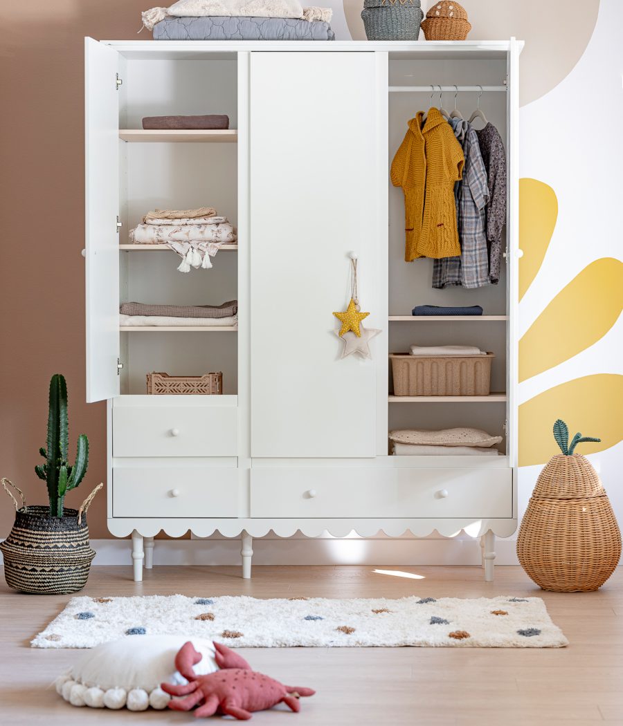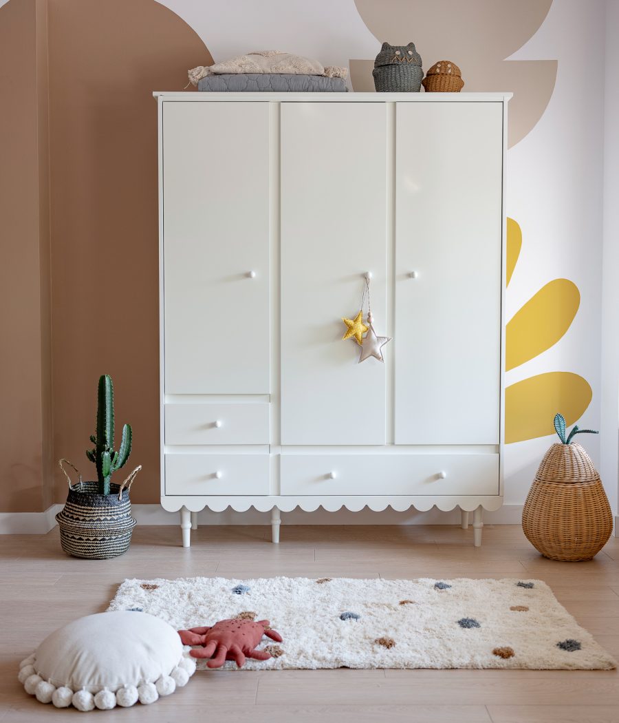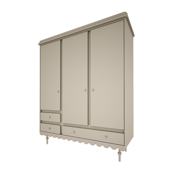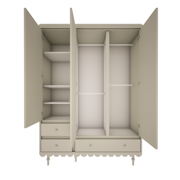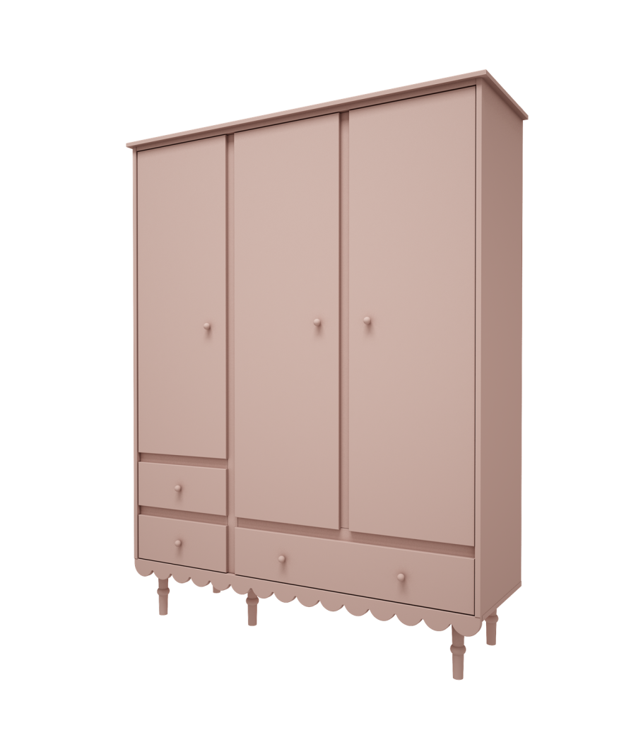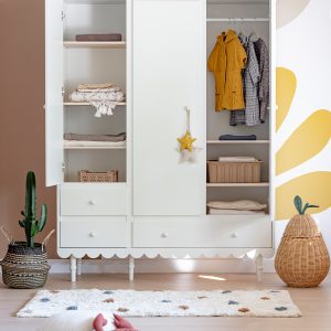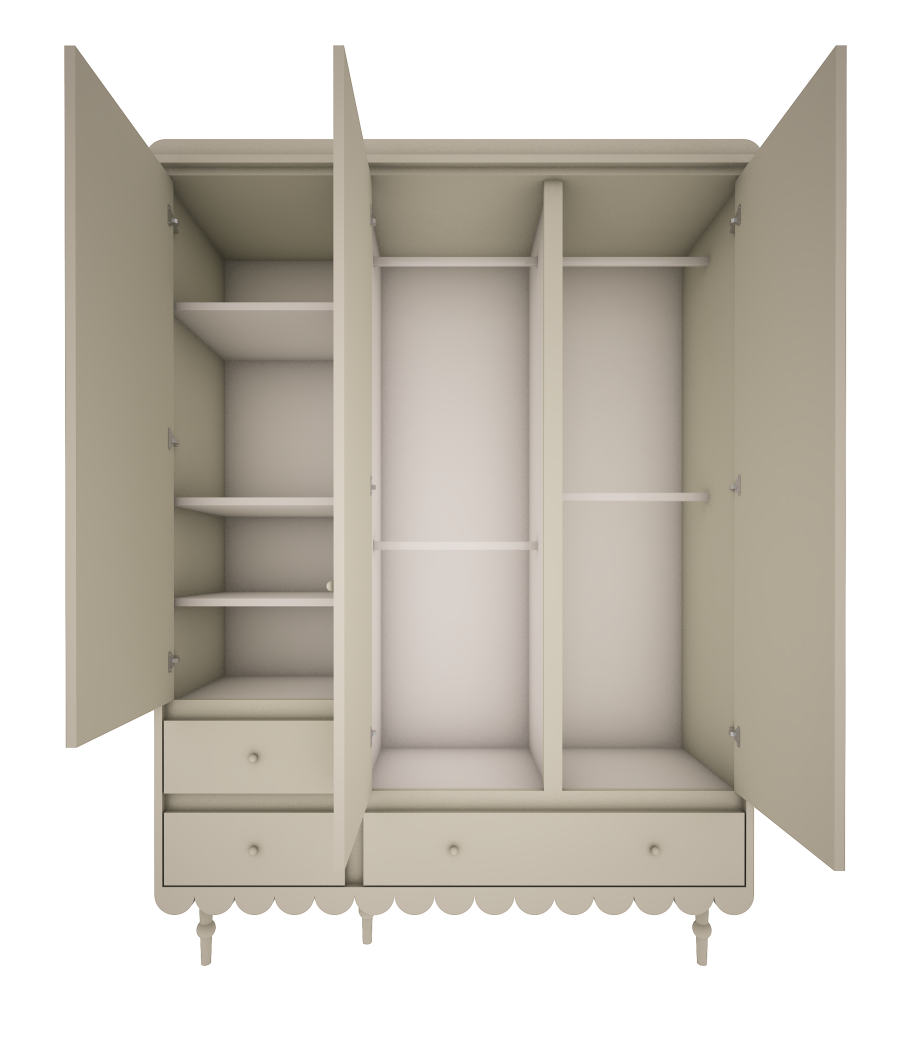 Trokrilni ormar opremljen je s dvije šipke za vješanje koje pristaju i na lijevu i na desnu stranu ormara. Pomične police s obje strane omogućuju preuređivanje unutrašnjosti ormara po želji. Dvije prostrane ladice dodatni su prostor za odlaganje. Ladica i vrata su opremljeni vrlo kvalitetnim samozatvarajućim vodilicama i pantima. Izrađen je od lameliranih ploča, nogice od bukvinog drva te bojanog MDF-a. Dimenzije ormara su 154 x 50 x 203 cm. Svi elementi bojani su vodenim lakom certificiranim za usklađenost sa EN71/3 sigurnosnom normom.