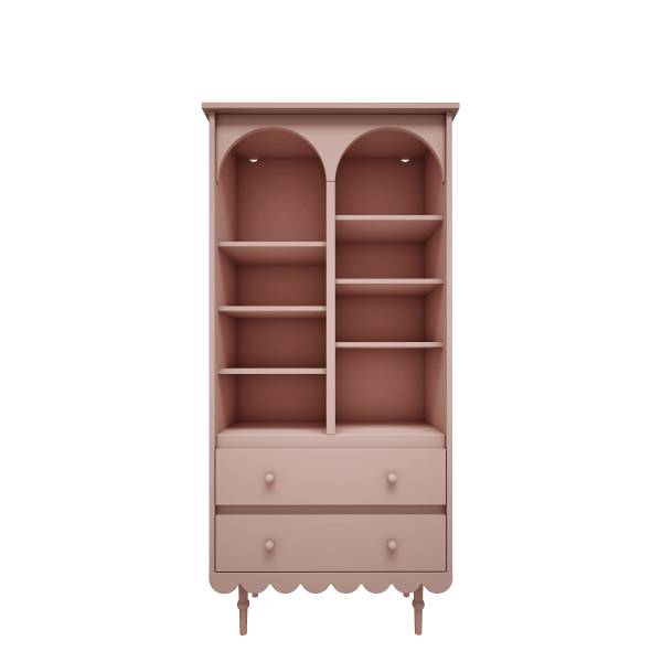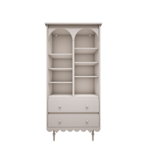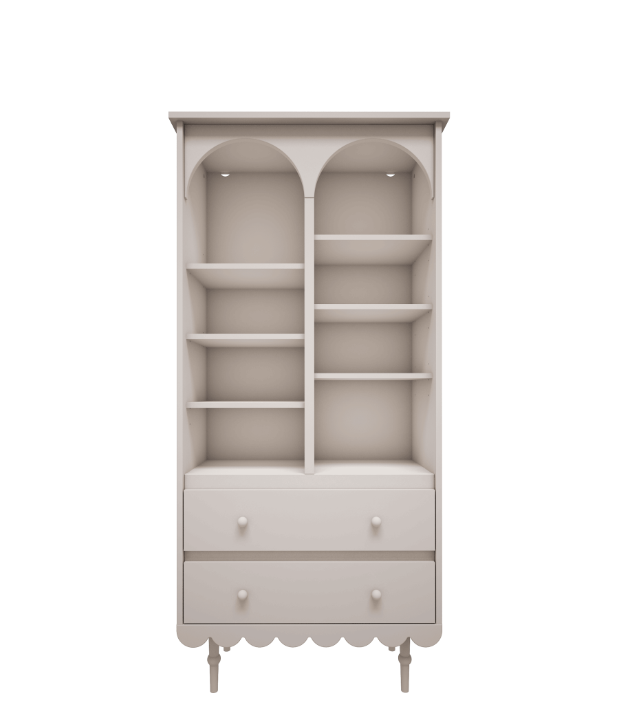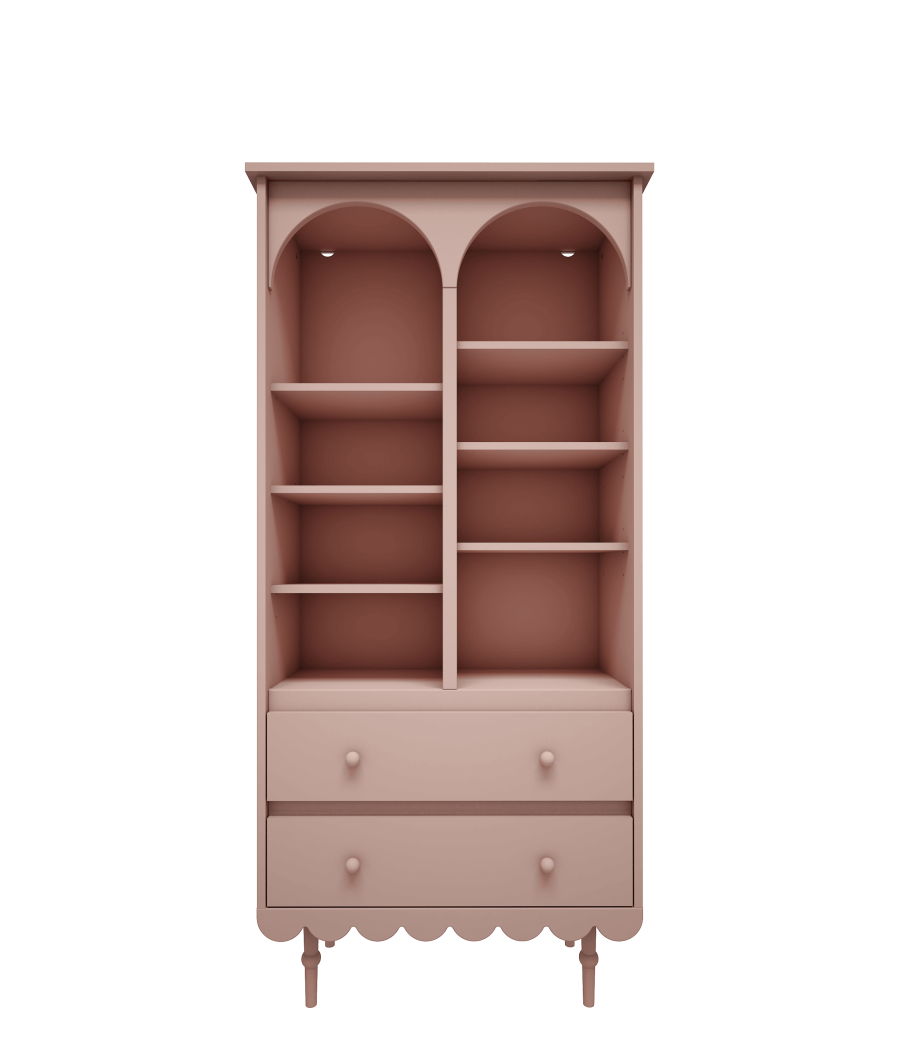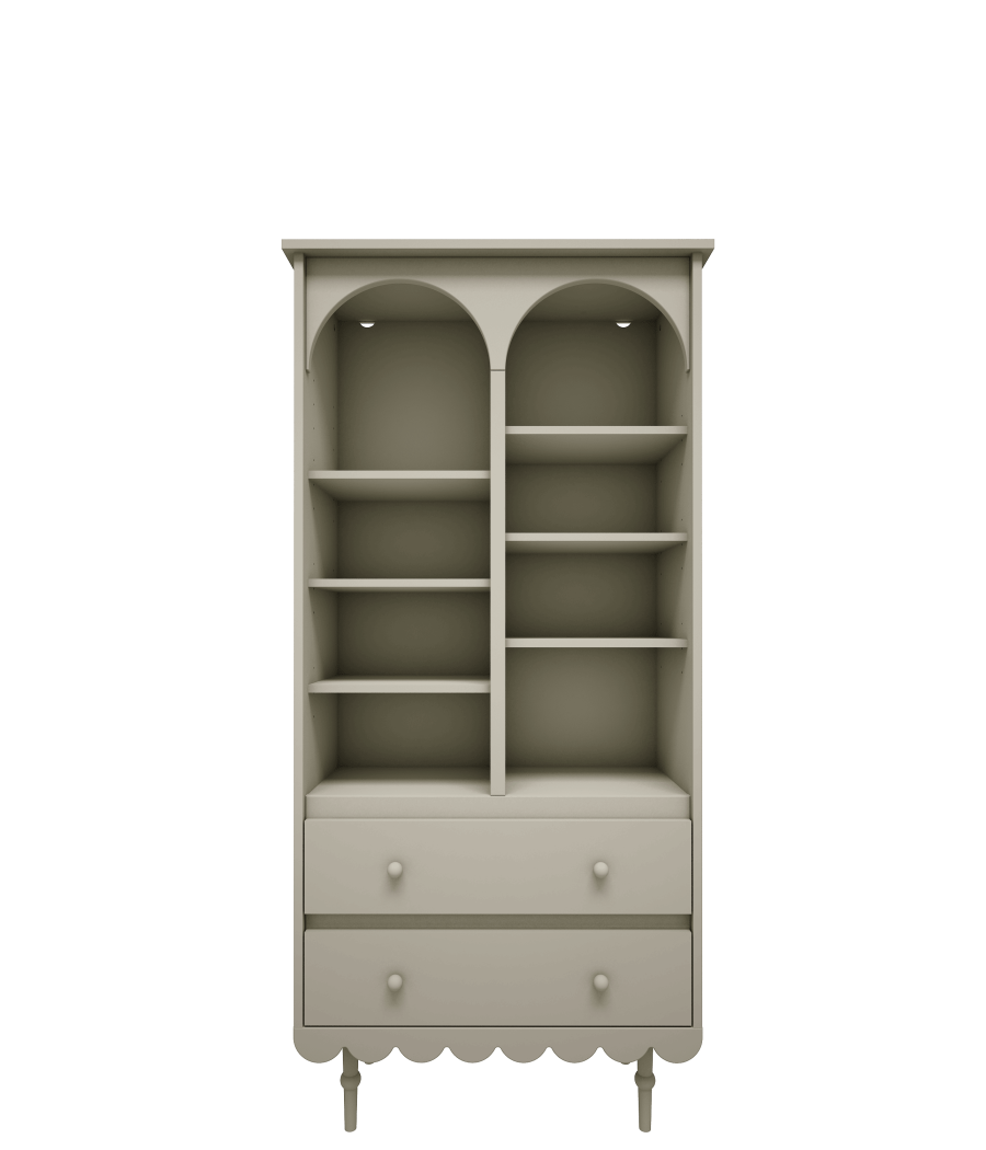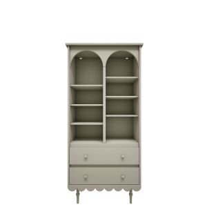 Polica Babushka izrađena je od lameliranih ploča, nogice od bukvinog drva te bojanog MDF-a. Dimenzije police su 84 x 35 x 140 cm. Ladice su opremljene vrlo kvalitetnim samozatvarajućim vodilicama i pantima. Svi elementi bojani su vodenim lakom certificiranim za usklađenost sa EN71/3 sigurnosnom normom.