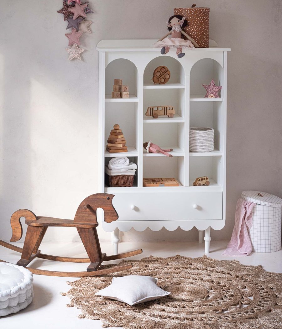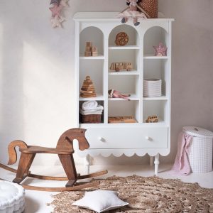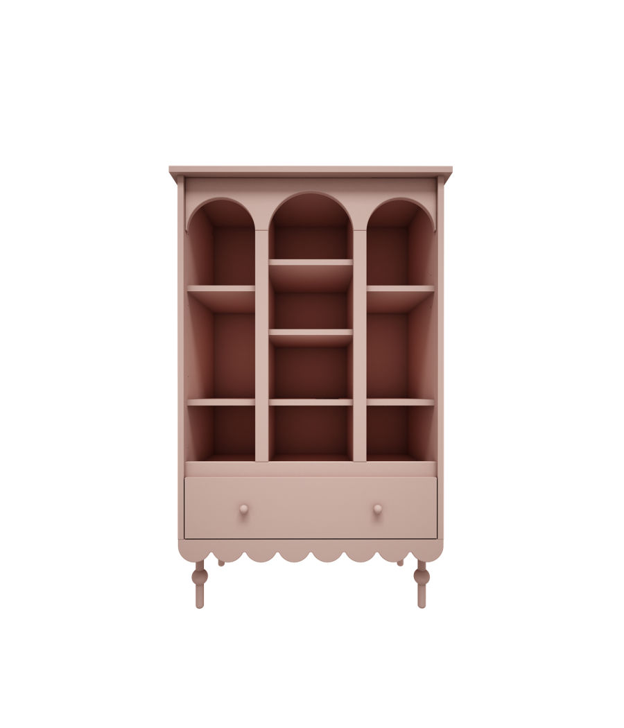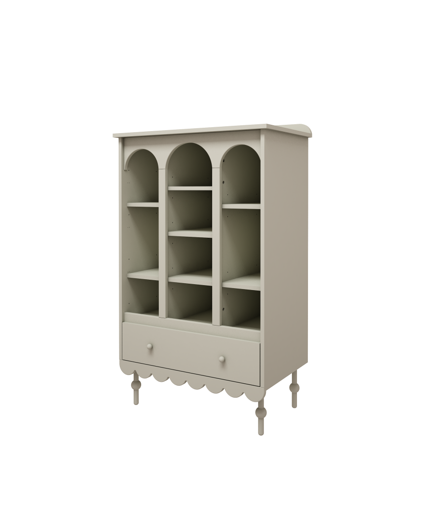 Polica Babushka izrađena je od lameliranih ploča, nogice od bukvinog drva te bojanog MDF-a. Dimenzije police su 84 x 35 x 140 cm. Ladice su opremljene vrlo kvalitetnim samozatvarajućim vodilicama i pantima. Svi elementi bojani su vodenim lakom certificiranim za usklađenost sa EN71/3 sigurnosnom normom.