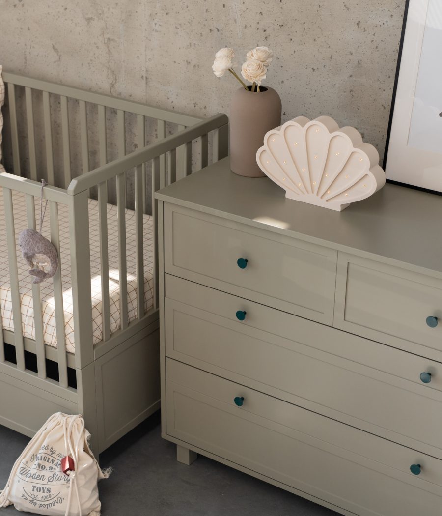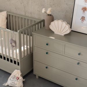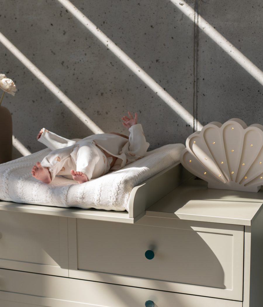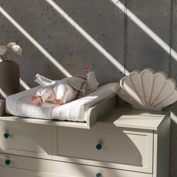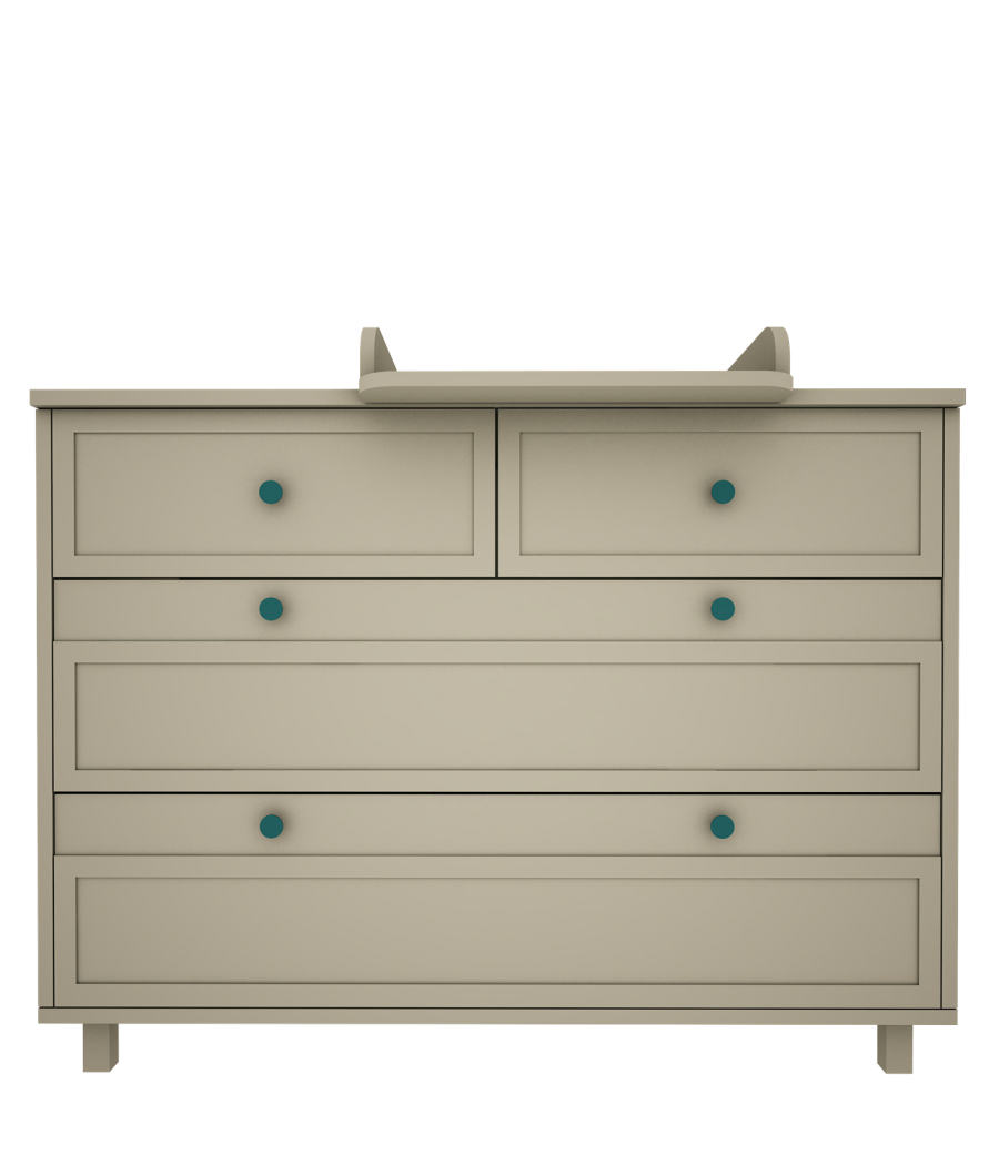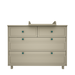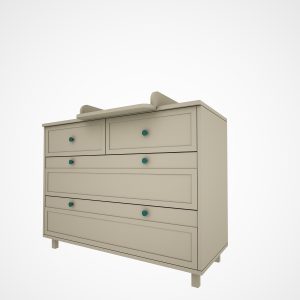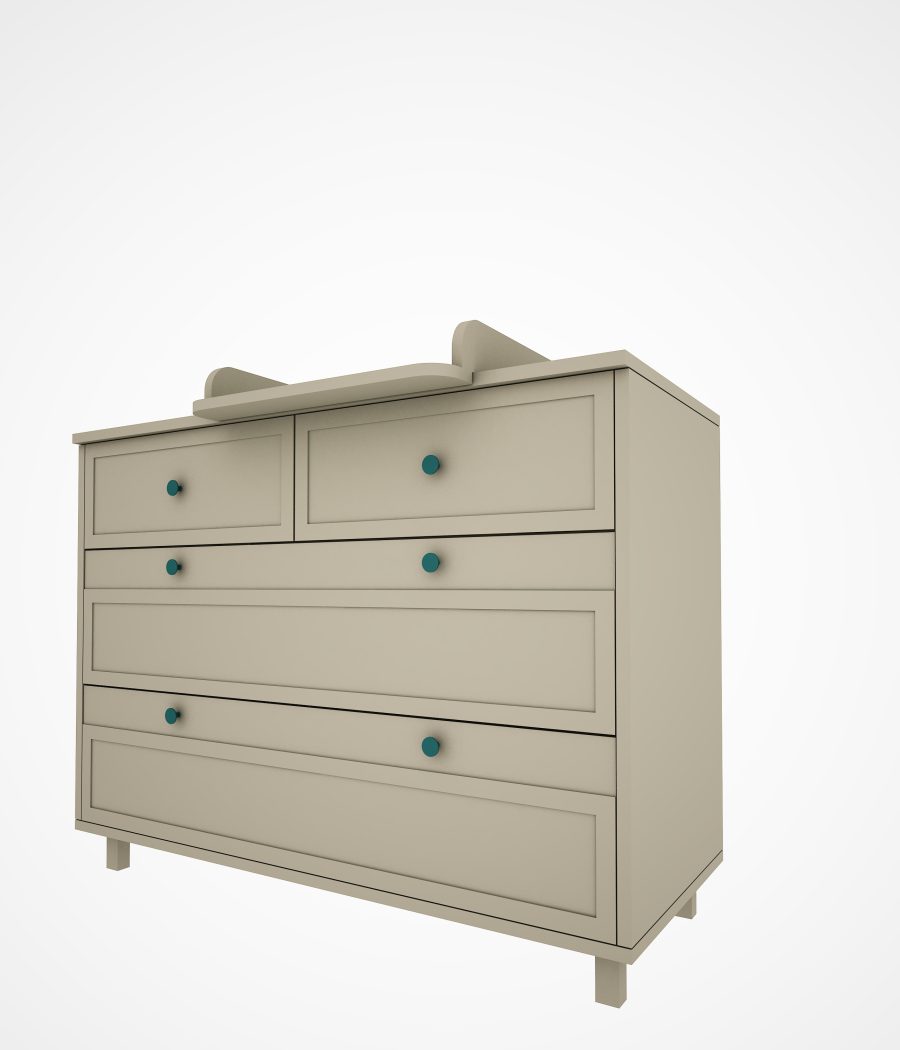 Gornja ploča za previjanje  izvedena je od MDF-a. Jednostavno se montira na komodu, omogućujući roditeljima da na vrlo praktičan način obavljaju sve aktivnosti njege oko svog djeteta. Komoda za previjanje namijenjena je djeci od rođenja do 12 mjeseci/11 kg. Izrađena je od bojanog MDF-a. Dimenzija ploče su 79 x 59 x 11 cm. Svi elementi bojani su vodenim lakom certificiranim za usklađenost sa EN71/3 sigurnosnom normom.