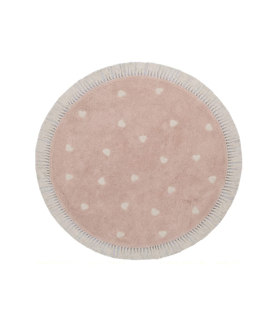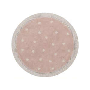 Ručno izrađen od recikliranog pamuka. Zbog različitih visina flore, bijela srca su jasno vidljiva na ružičastom tepihu. Na početku korištenja mogu se pojaviti sitne dlake, koje su vlakna iz samog procesa, a tepih će se postupno sve manje i manje osipati i na kraju prestati. Promjer tepiha je 130 cm.