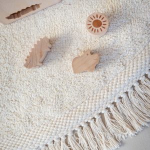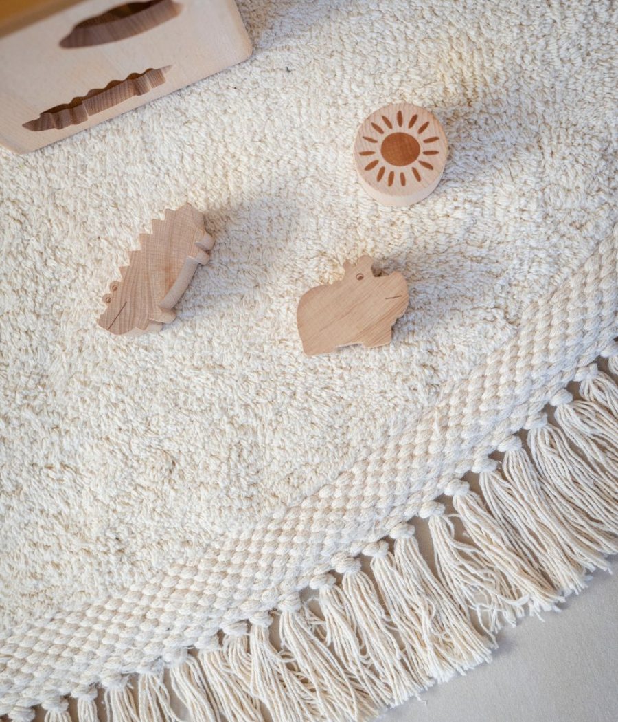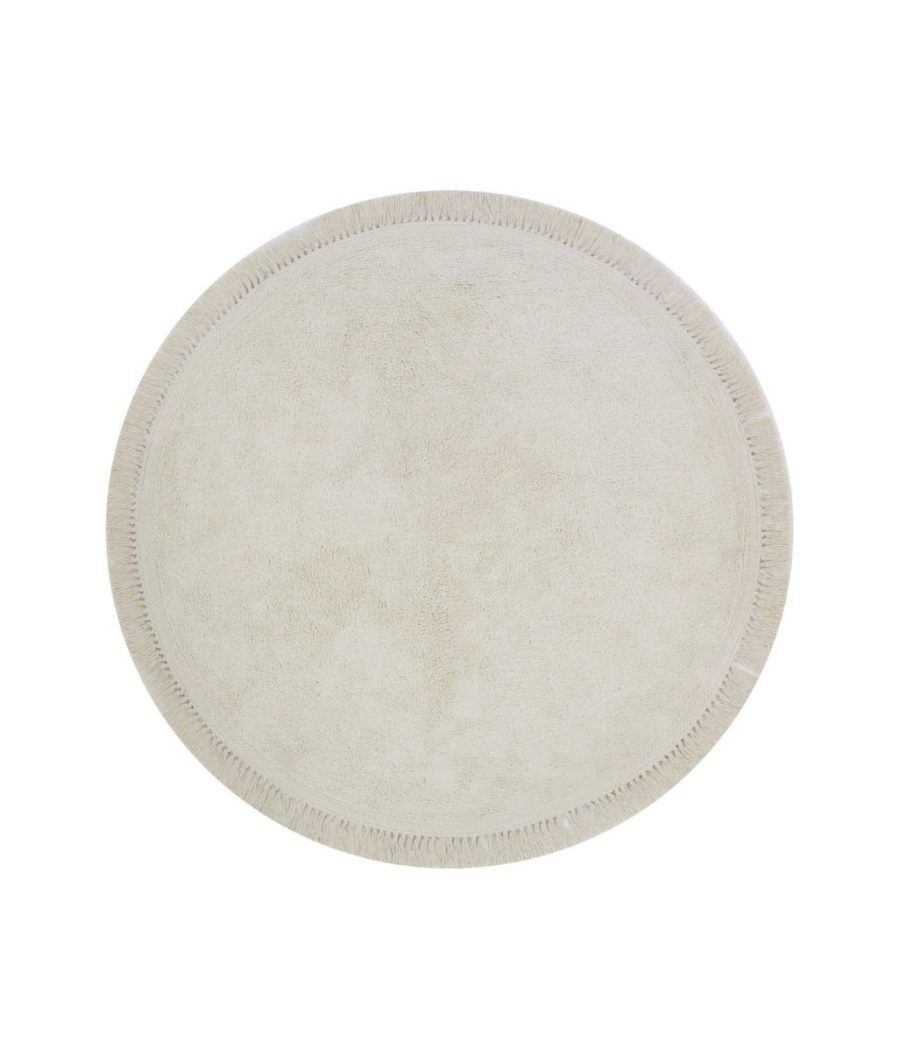 Ručno izrađen od recikliranog pamuka. Na početku korištenja mogu se pojaviti sitne dlake, koje su vlakna iz samog procesa, a tepih će se postupno sve manje i manje osipati i na kraju prestati. Promjer tepiha je 160 cm.