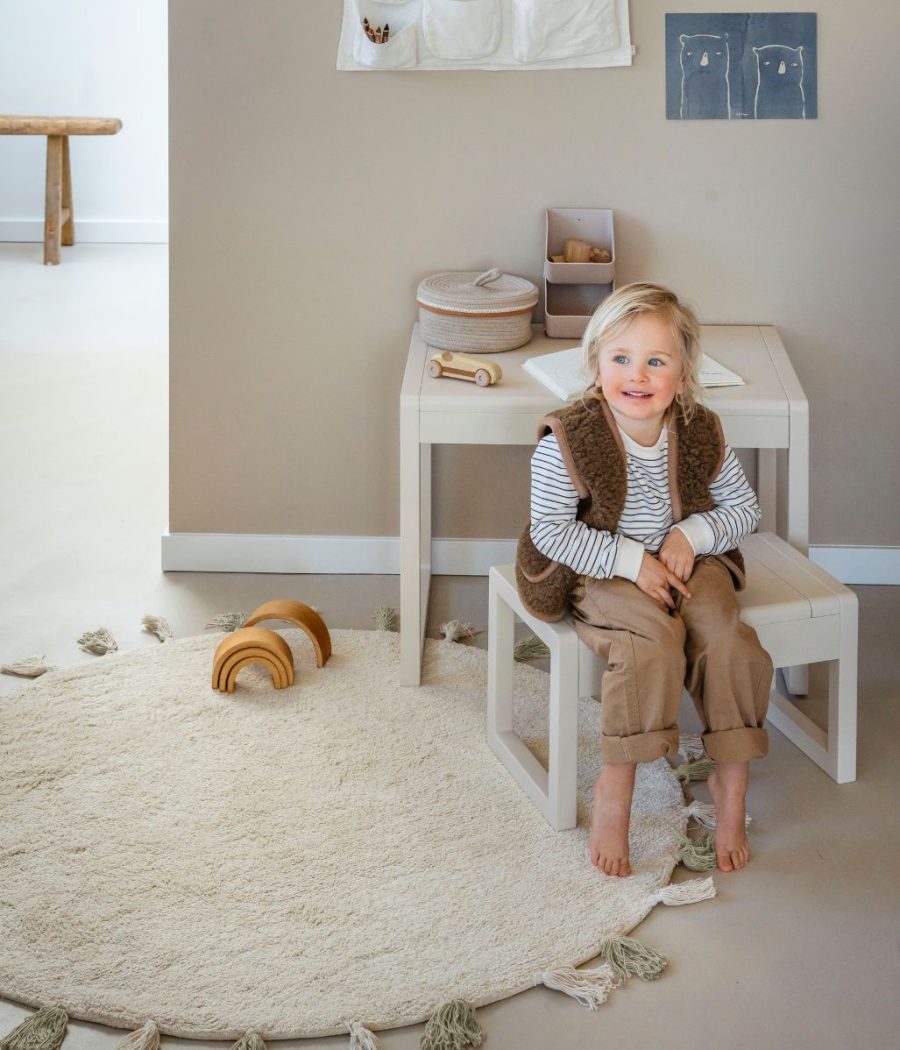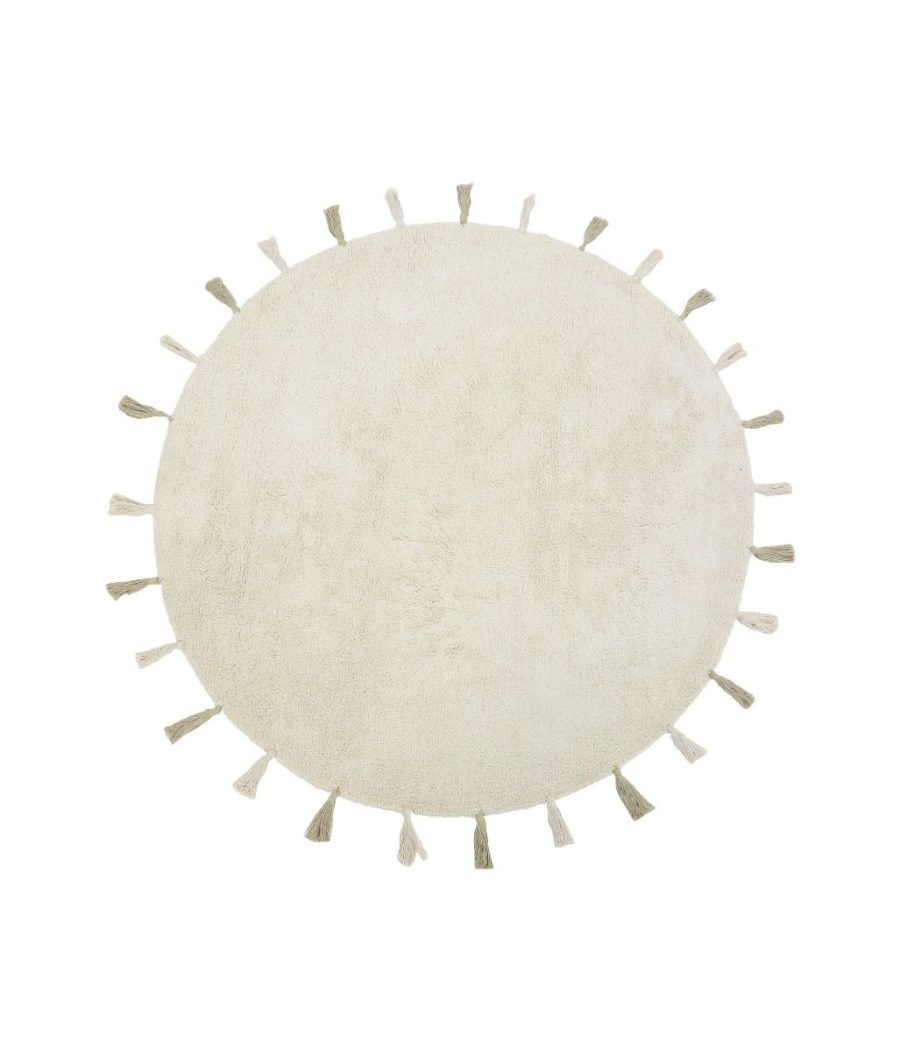 Ručno izrađen od recikliranog pamuka. Na početku korištenja mogu se pojaviti sitne dlake, koje su vlakna iz samog procesa, a tepih će se postupno sve manje i manje osipati i na kraju prestati. Promjer tepiha je 130 cm.