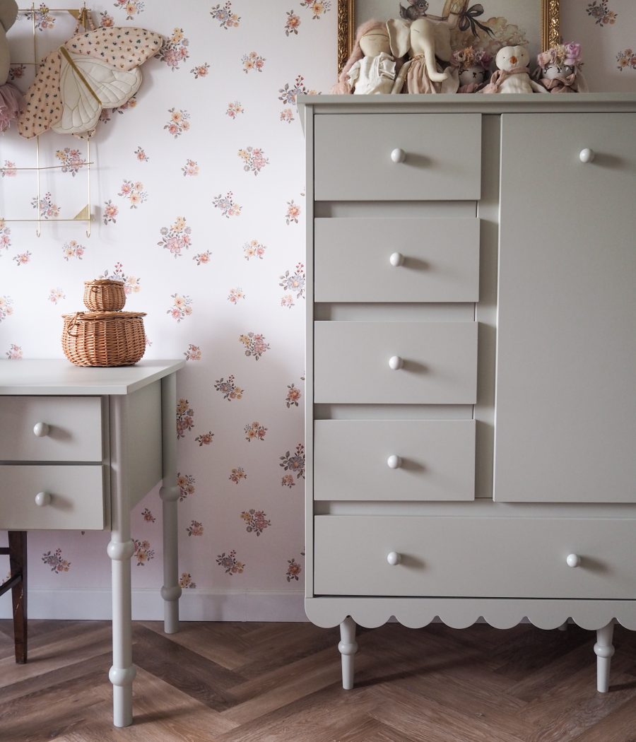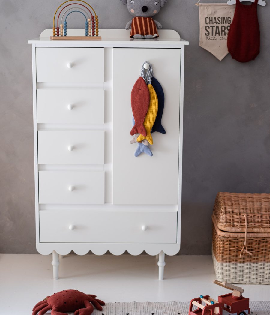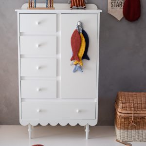 Komoda Babushka izrađena je od lameliranih ploča, nogice od bukvinog drva te bojanog MDF-a. Ladice su opremljene vrlo kvalitetnim samozatvarajućim vodilicama i pantima. Dimenzije komode su 84 x 50 x 140 cm. Svi elementi bojani su vodenim lakom certificiranim za usklađenost sa EN71/3 sigurnosnom normom.