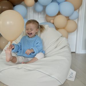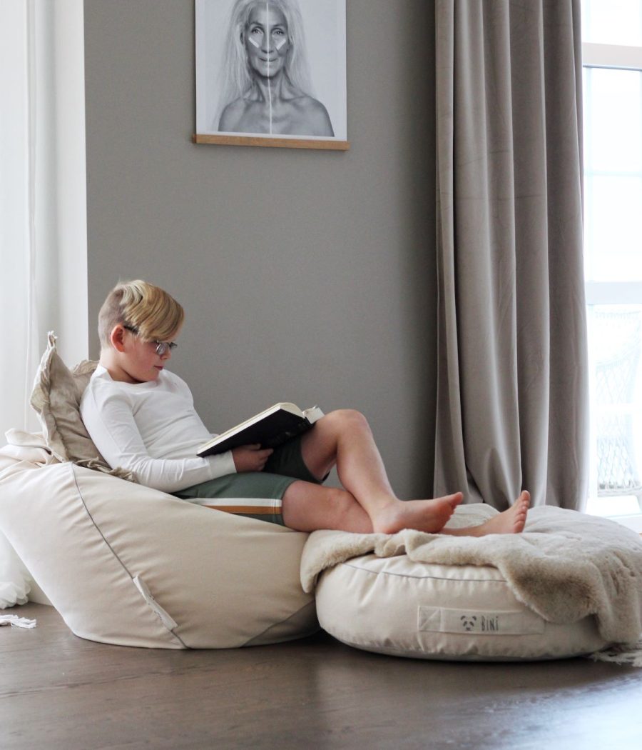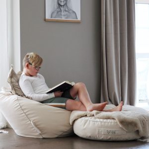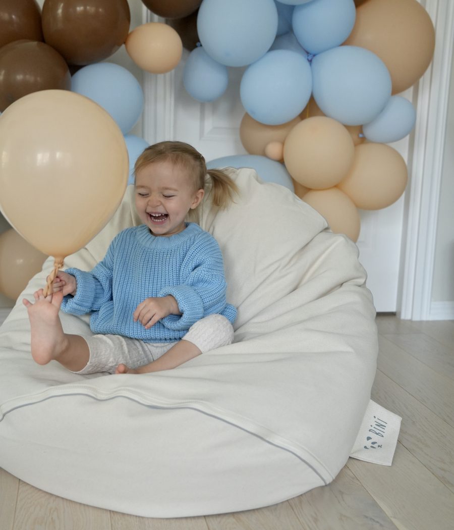 Pamučna vreća za sjedenje - lagana djeci za nošenje tijekom igre a dovoljno podupiruća odraslima za udobno sjedenje. Izrađena od mekanog pamuka, unosi udobnost u svaku prostoriju. Dimenzije vreće promjer 80 cm, visina 110 cm. Navlaka: Izrađena od 100% pamuka. Oeko-Tex 100 i CE certifikat, koji jamče da je bez štetnih tvari. Unutarnja navlaka: izrađena od 100% poliestera, dizajnirana za jednostavnu promjenu navlake bez curenja kuglica. Umetak: izdašno ispunjen 100% prozračnim EPS kuglicama koje se prilagođavaju pokretima tijela.