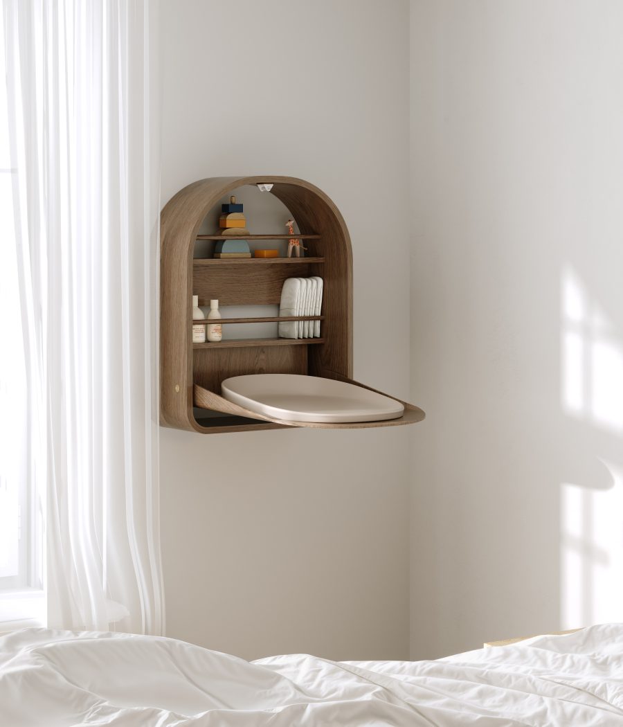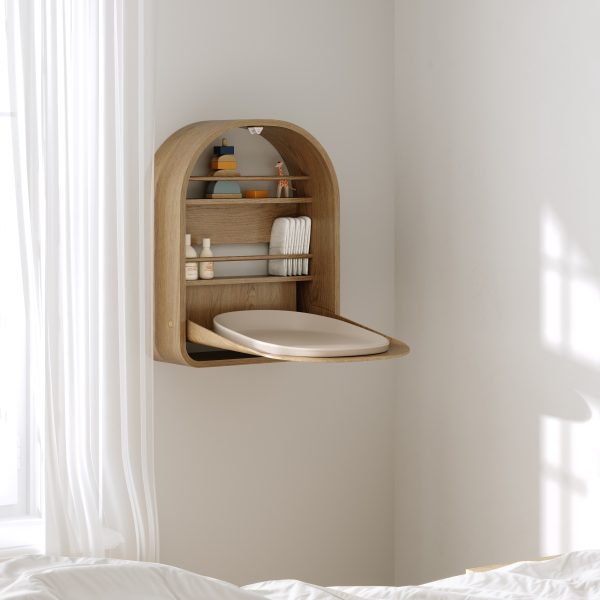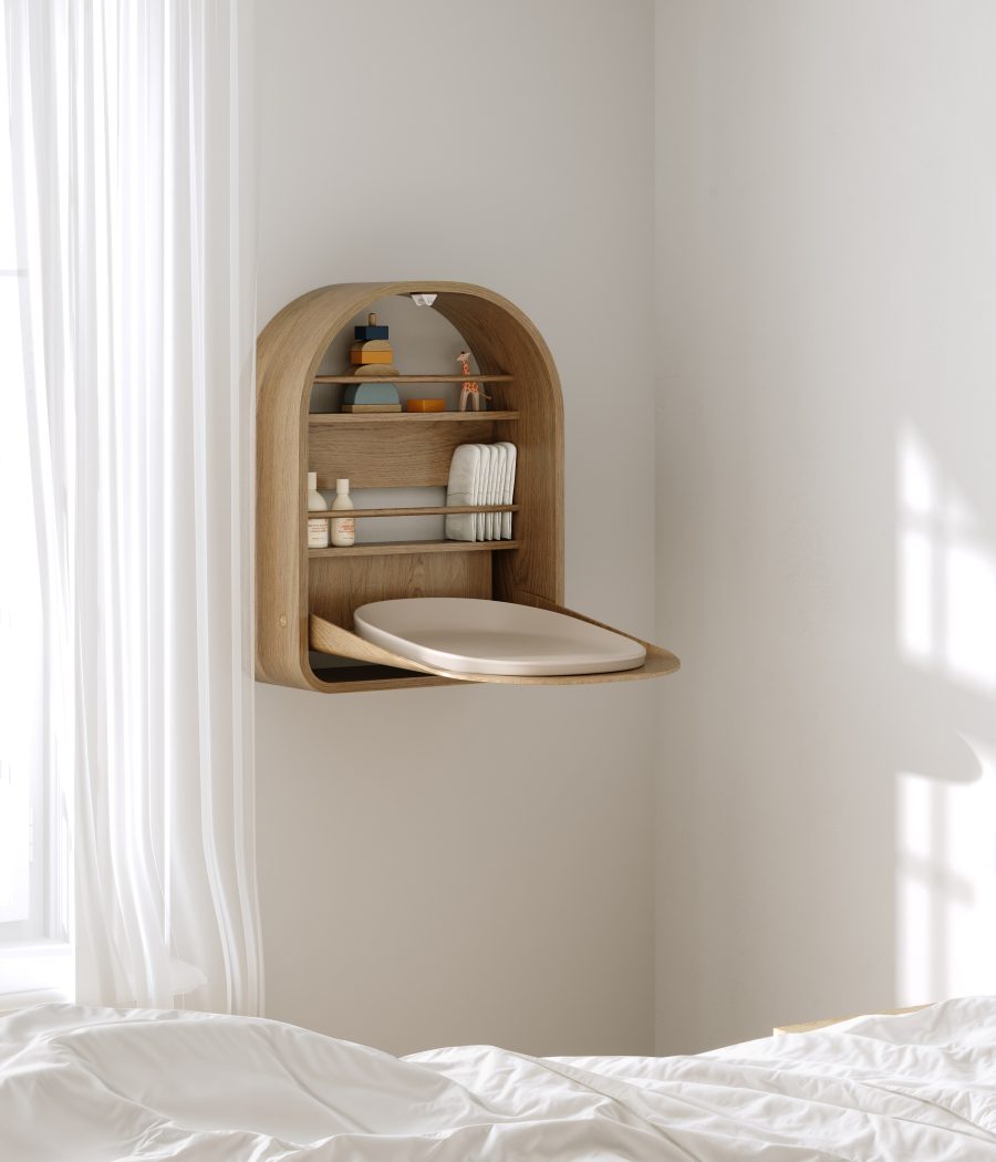 Kai stol za previjanje koji se montira na zid kombinira estetiku i funkcionalnost svojim glatkim, okruglim oblicima. Veličina stola je  75 x 59 x 23 cm. Savršen je za manje domove i prostorije koje štede prostor, nudeći i učinkovitost prostora i elegantan izgled. Stol za previjanje se lako otvara i zatvara pomoću sustava Easy Touch, što ga čini praktičnim i jednostavnim za korištenje. Dvije prostrane police, smještene točno iznad vas i vaše bebe, omogućuju jednostavan pristup svemu što vam je potrebno - od krema do pelena, vlažnih maramica i ostalih potrepština. Kai stol za previjanje savršeno se uklapa sa stolom za previjanje, zahvaljujući svom ovalnom dizajnu, stvarajući skladno i funkcionalno rješenje za vrijeme presvlačenja.