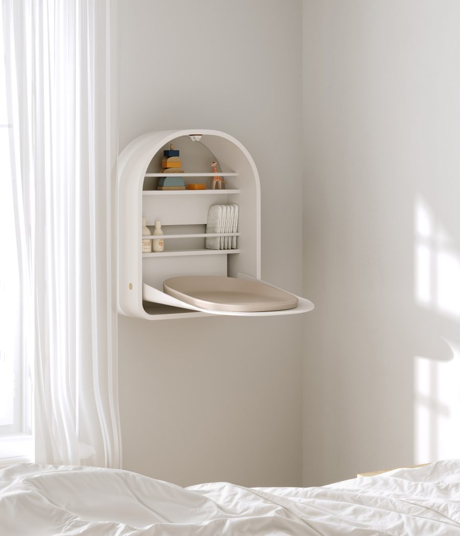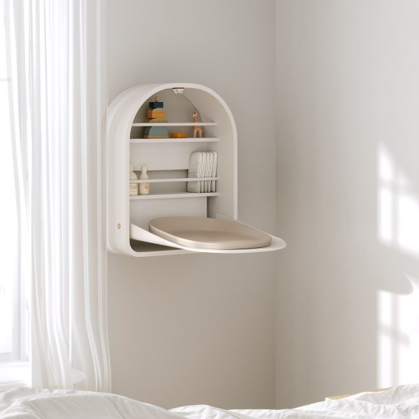 Kai stol za previjanje koji se montira na zid kombinira estetiku i funkcionalnost svojim glatkim, okruglim oblicima. Veličina stola je  75 x 59 x 23 cm. Savršen je za manje domove i prostorije koje štede prostor, nudeći i učinkovitost prostora i elegantan izgled. Stol za previjanje se lako otvara i zatvara pomoću sustava Easy Touch, što ga čini praktičnim i jednostavnim za korištenje. Dvije prostrane police, smještene točno iznad vas i vaše bebe, omogućuju jednostavan pristup svemu što vam je potrebno - od krema do pelena, vlažnih maramica i ostalih potrepština. Kai stol za previjanje savršeno se uklapa sa stolom za previjanje, zahvaljujući svom ovalnom dizajnu, stvarajući skladno i funkcionalno rješenje za vrijeme presvlačenja.